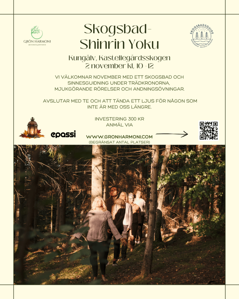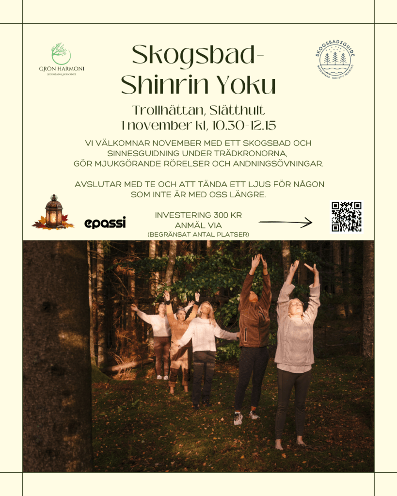 Minst tre deltagare för genomförande. Begränsat antal platser. Det kan vara det sista skogsbadet i Trollhättan för i år. Swish eller Epassi som betalning.