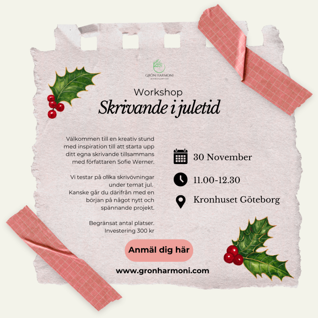 Välkommen till en kreativ och stund i Kronhuset Göteborg för skrivworkshop under temat jul. Vi inspireras tillsammans via olika skrivövningar och går kanske därifrån med en spännande början på något nytt skrivprojekt. Tag med eget skrivblock och penna, alternativt dator om du önskar.