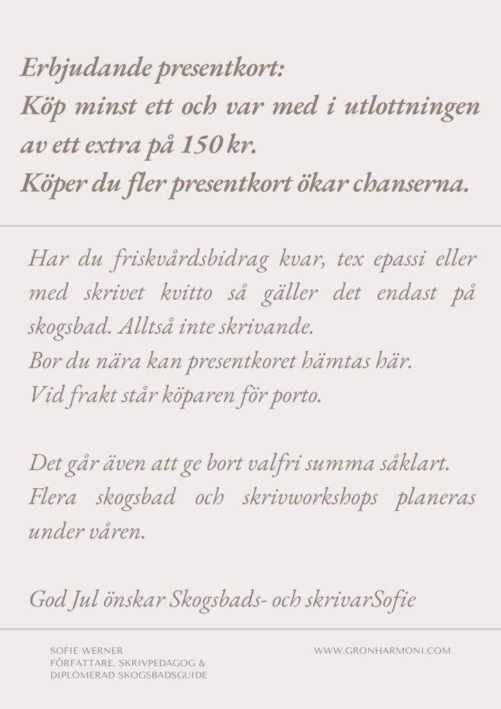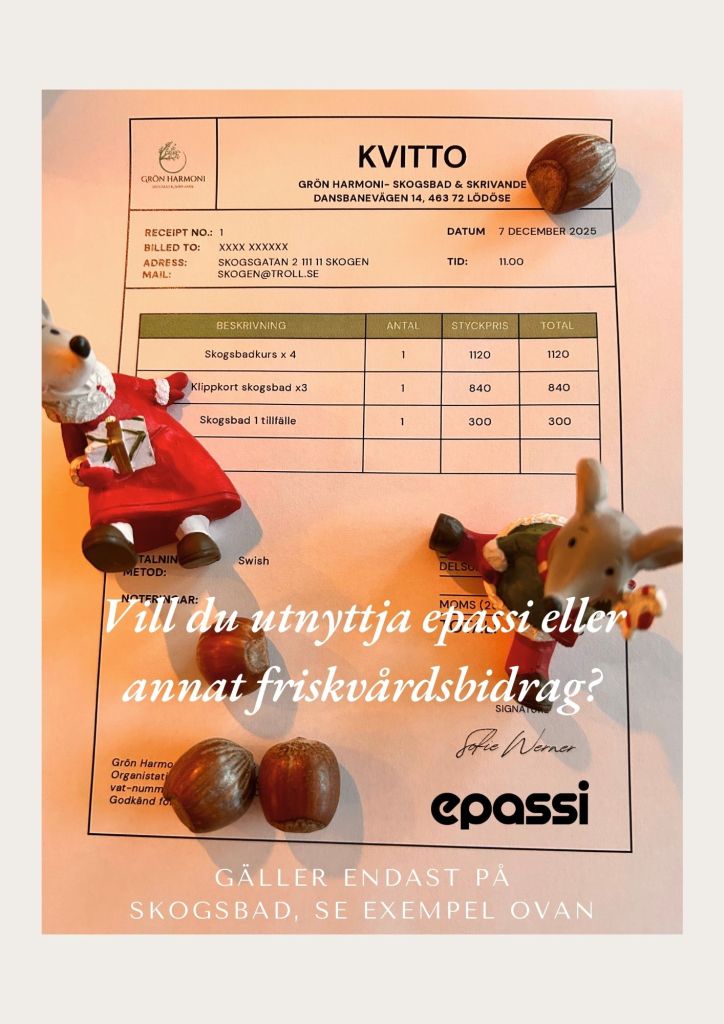 Betalning i samband med anmälan via kontaktformulär, eller privat meddelande. Skriv namn, telefon, adress, vilket skogsbad och datum du önskar medverka, så återkopplar jag om plats finnes.