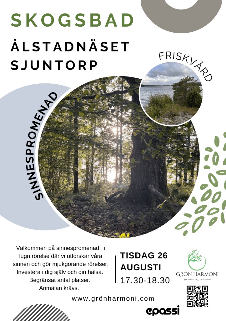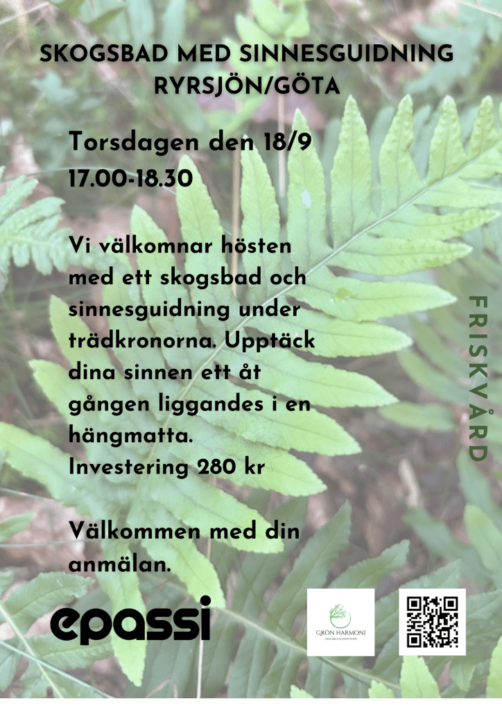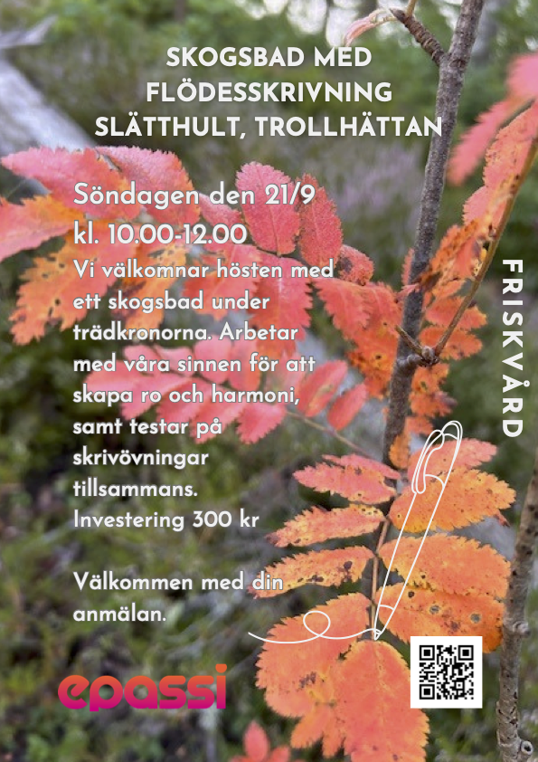 Jag erbjuder under September två olika skogsbad. Ett med flödesskrivning i Trollhättan Slätthult och ett i Lilla Edet, runt Ryrsjön med hängmattor.
