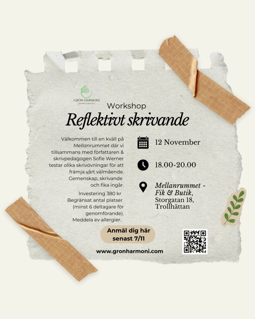 Alla som deltar får en skrivbok och fika. Meddela ev. allergier vid anmälan.