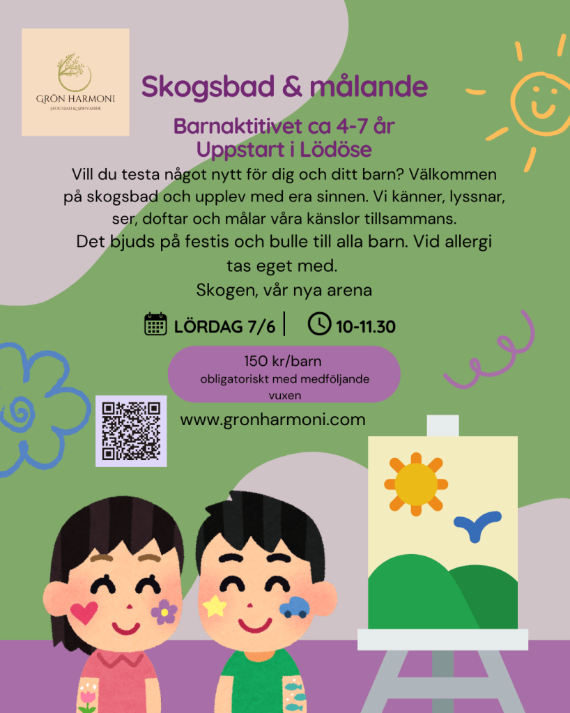 Varmt välkomna att boka in dig och ditt barn för ett välgörande stund i skogen där vi leker med våra sinnen. Utforskar, känner oss fram och målar tillsammans.